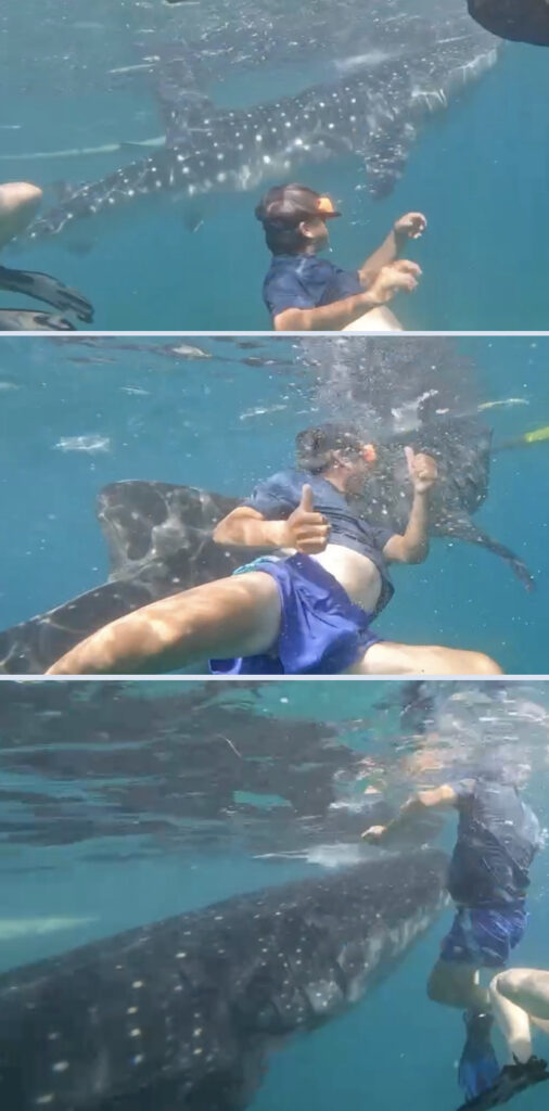 ジンベイザメはすぐ間近まで寄ってくるが、決して触れてはいけない。ツアー会社がGoproで撮影してくれる。