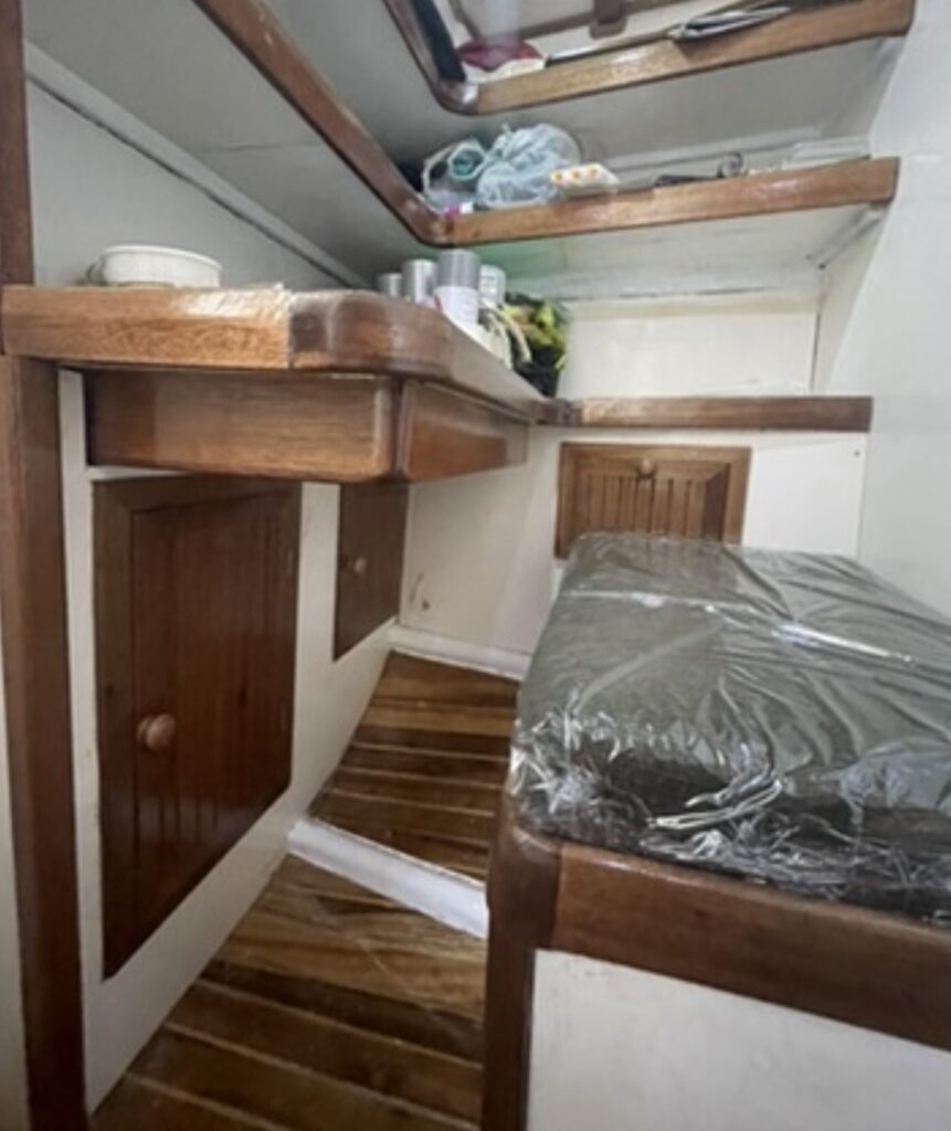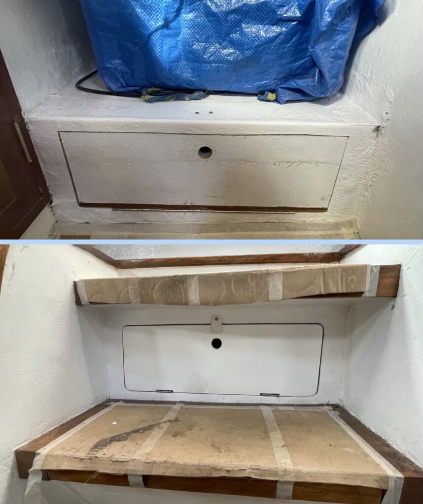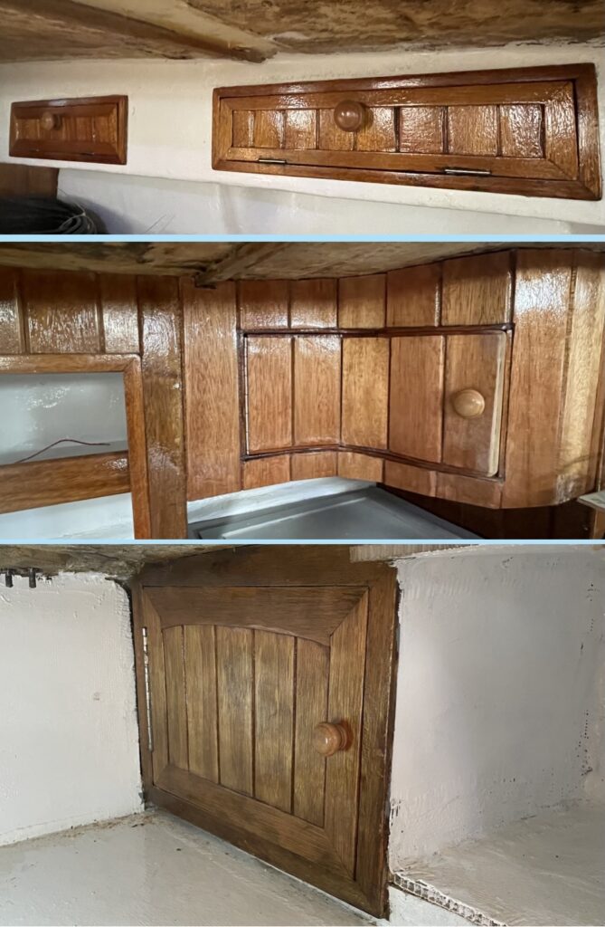 Wooden storage doors in a main cabin and a galley have been installed with hinges and door stoppers.