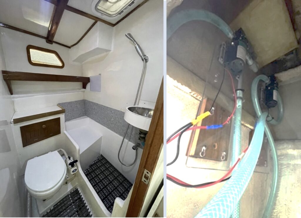 スターンヘッド、シャワー室も完成。排水管のポンプの揚程が足らず排水できなかったが、吸い込み側ホースに逆流防止弁、排出側ホースを一旦上に上げてポンプインペラ部に常に呼び水を残すように工夫した結果、うまく作動するようになった。