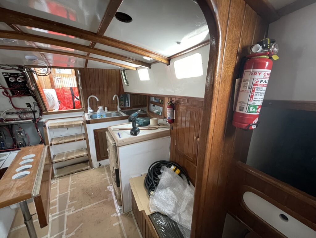 The wooden components of the upper cabin were reinstalled after varnish finishing. The deep brown of the teak wood contrasts beautifully with the white panels.