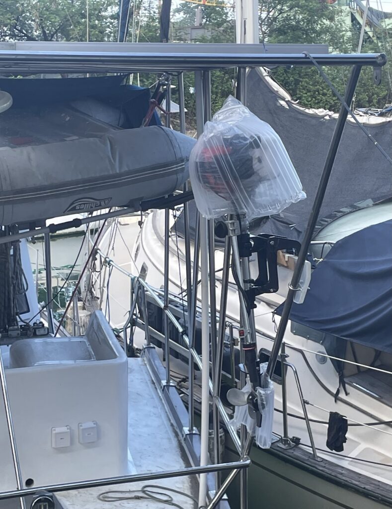 The Chinese-made 50cc two-stroke outboard motor I ordered from Lazada last fall. I’ve mounted the bracket and plan to attach it to the Achilles rubber boat behind. A landing dinghy!