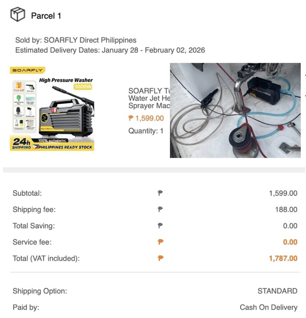 デッキの清掃のために、ハイプレッシャーウォシャーを購入。艇に積載するため小型でパワフルなのを選択。まあまあ満足の品。(1ペソ=2.7円)