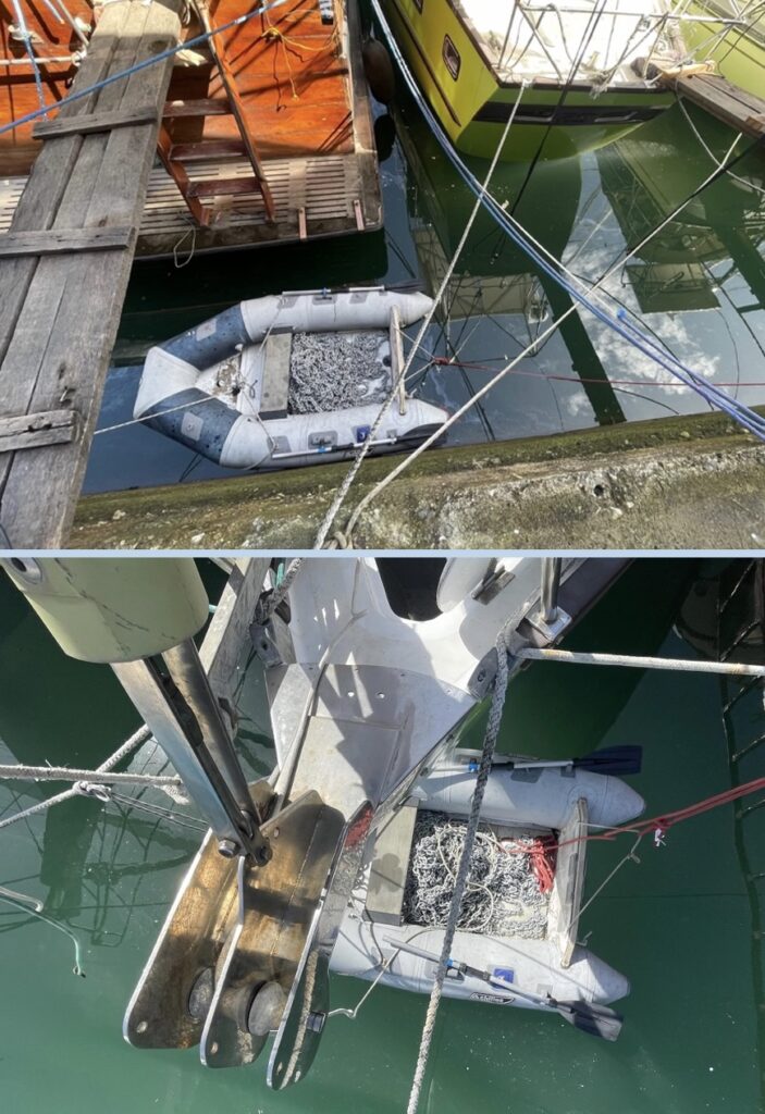 The chain was placed on the tender and hauled it up using the bow windlass on the Isana.