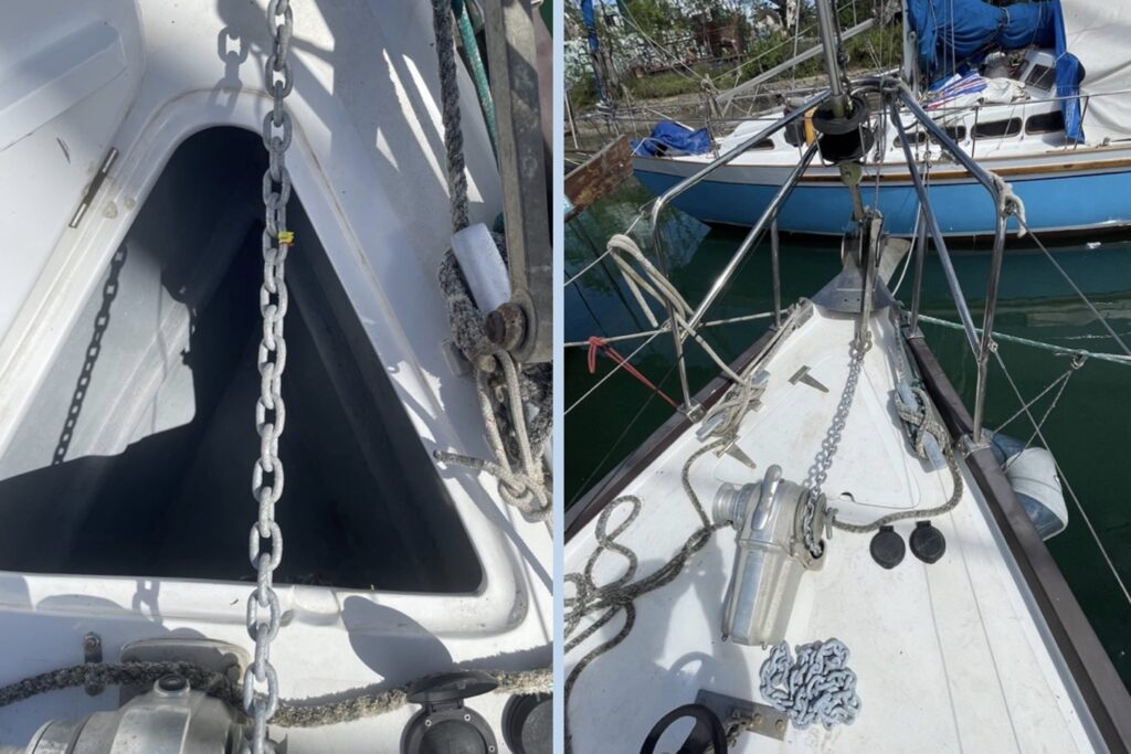 The 80-meter length is marked with red and yellow cable ties. The full 90-meter anchor chain is stowed in the bow anchor pit.