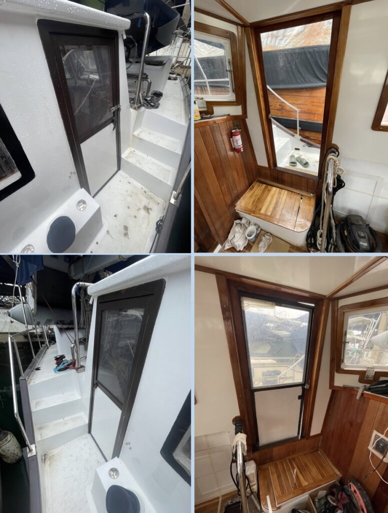 Upper cabin entrance door. The interior features a varnish finish, while the exterior is finished with acrylic paint matching the gunwale color for enhanced saltwater resistance.