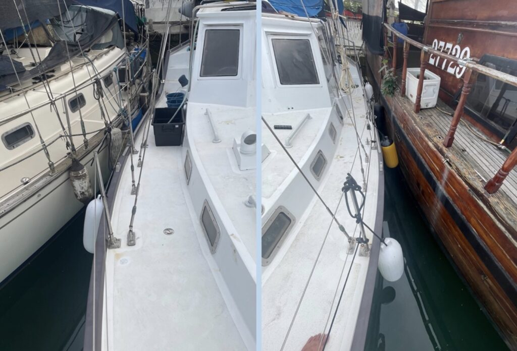 Preparations for the voyage are progressing. The original anchor chain had rusted solid, so we asked workers at the shipyard to procure a used one. We connected 10mm chain sections measuring 37m and 57m after soaking them in a pit, creating a 90m length. The total weight is 68kg + 118kg = 186kg. We attached a 30kg plow anchor suitable for most seabeds. While a 5:1 anchor load ratio is sufficient for the full chain length, the Isana’s bow freeboard is approximately 2m high, allowing it to handle depths down to 16m. This means we no longer need to worry about anchoring for the time being.