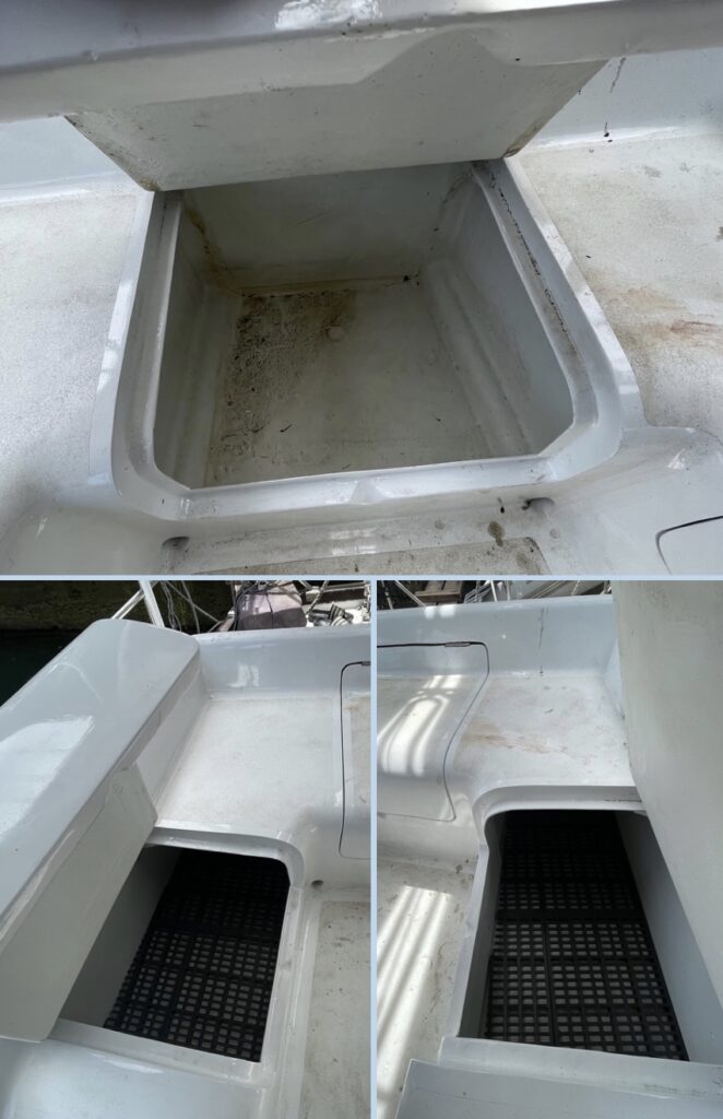 スターンのコックピット座席下には3つの収納スペース。ポート、スターボのスペースはフェンダー各2個で一杯。センター部にはテンダーの燃料とアンカーを収納予定。