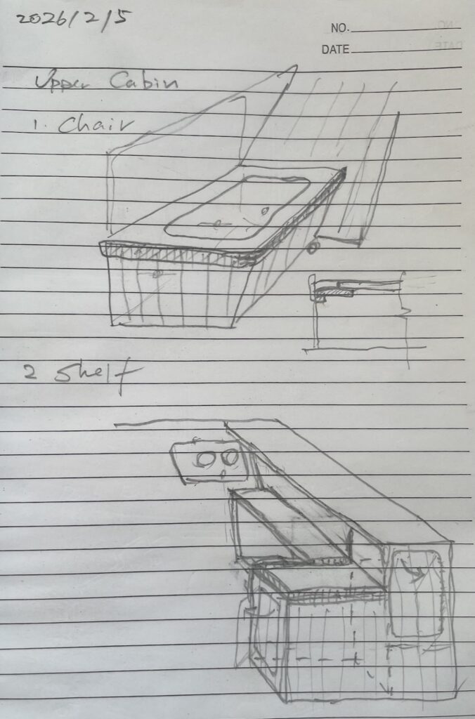 アッパーキャビンの座席と棚、製作途中。
