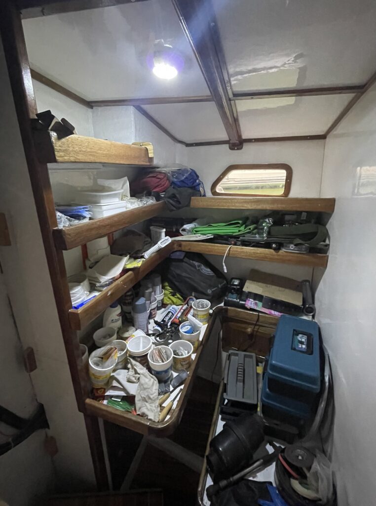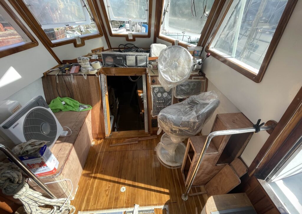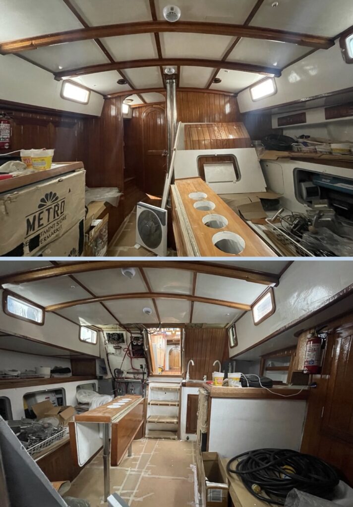 アッパーキャビンの最後の大工仕上げ。ポートサイドには座席、スターボサイドには収納付き棚。