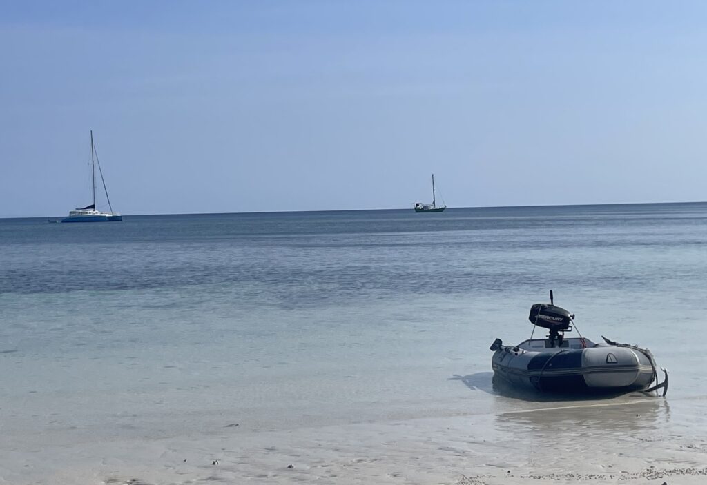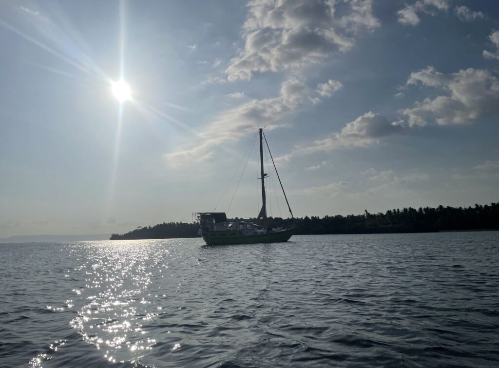 2020年春、コロナ禍が世界を席巻する直前にダナオからフェリーに乗ってバイクで訪れた、サンチャゴベイサンクチュアリ。あれから6年が経過したが沖合には当時と同じ青いカタマランが停泊していた。あの時にここに勇魚で戻ってくることを誓ったが、ようやく実現することができた。美しい海と大きく広がる砂浜は、あの時のままだった。